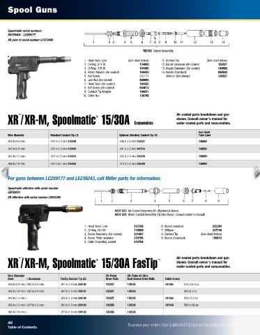 XR /XR-M, Spoolmatic 15/30A Consumables Air-cooled parts breakdown and gun 10 8 9 136821 — Wrench (standard length), nut tip contact 1 1 1